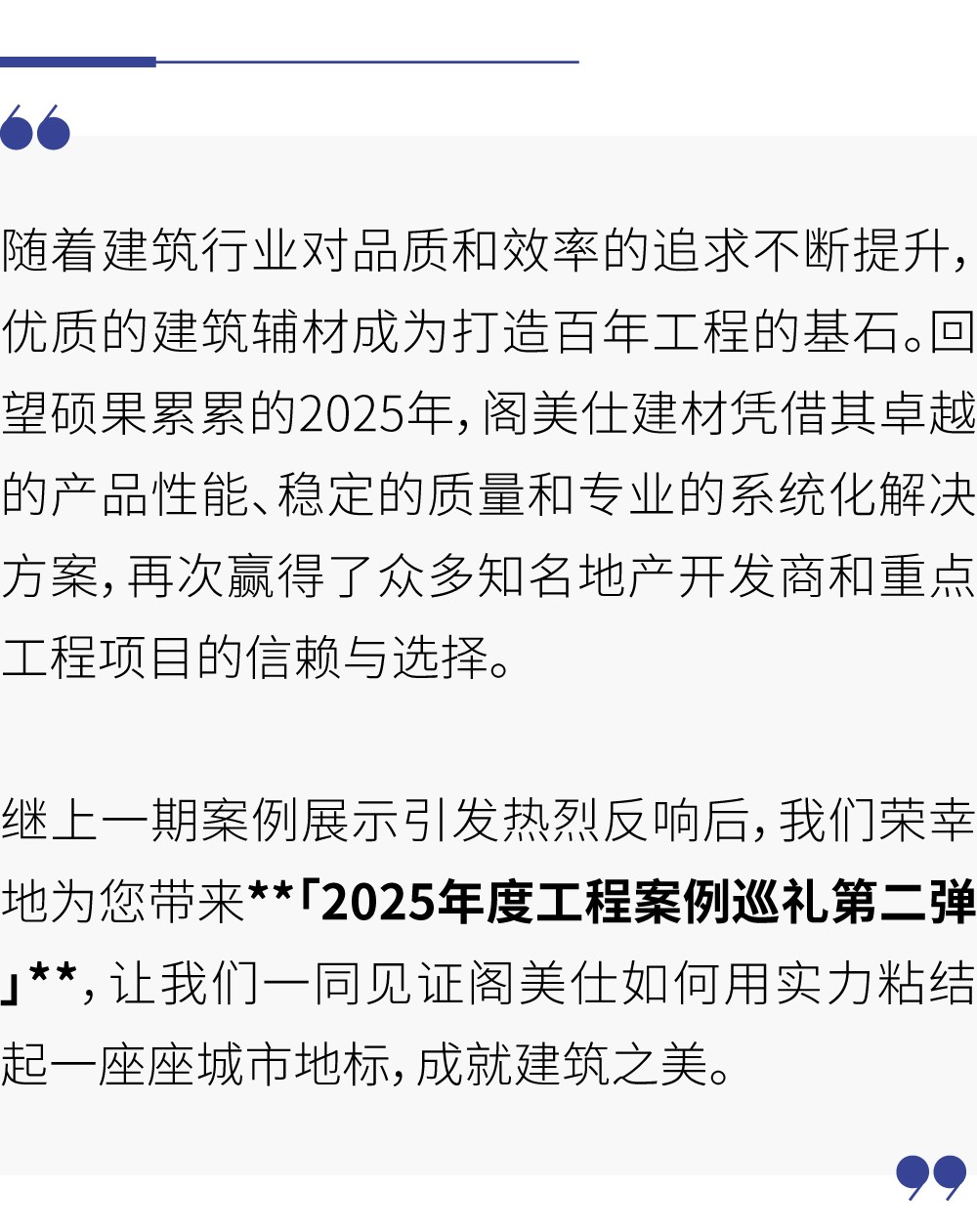 继上一期案例展示引发热烈反响后,我们荣幸地为您带来**「2025年度工程案例巡礼第二弹」**,让我们一同见证阁美仕如何用实力粘结起一座座城市地标,成就建筑之美。