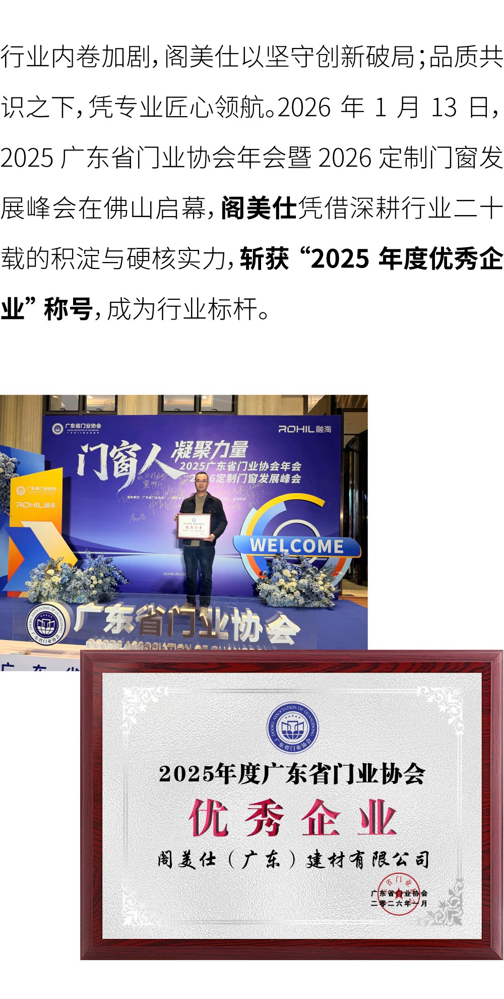 行业内卷加剧,阁美仕以坚守创新破局;品质共:识之下,凭专业匠心领航。2026年1月13日,2025广东省门业协会年会暨2026定制门窗发展峰会在佛山启幕,阁美仕凭借深耕行业二十载的积淀与硬核实力,斩获“2025年度优秀企业”称号,成为行业标杆。