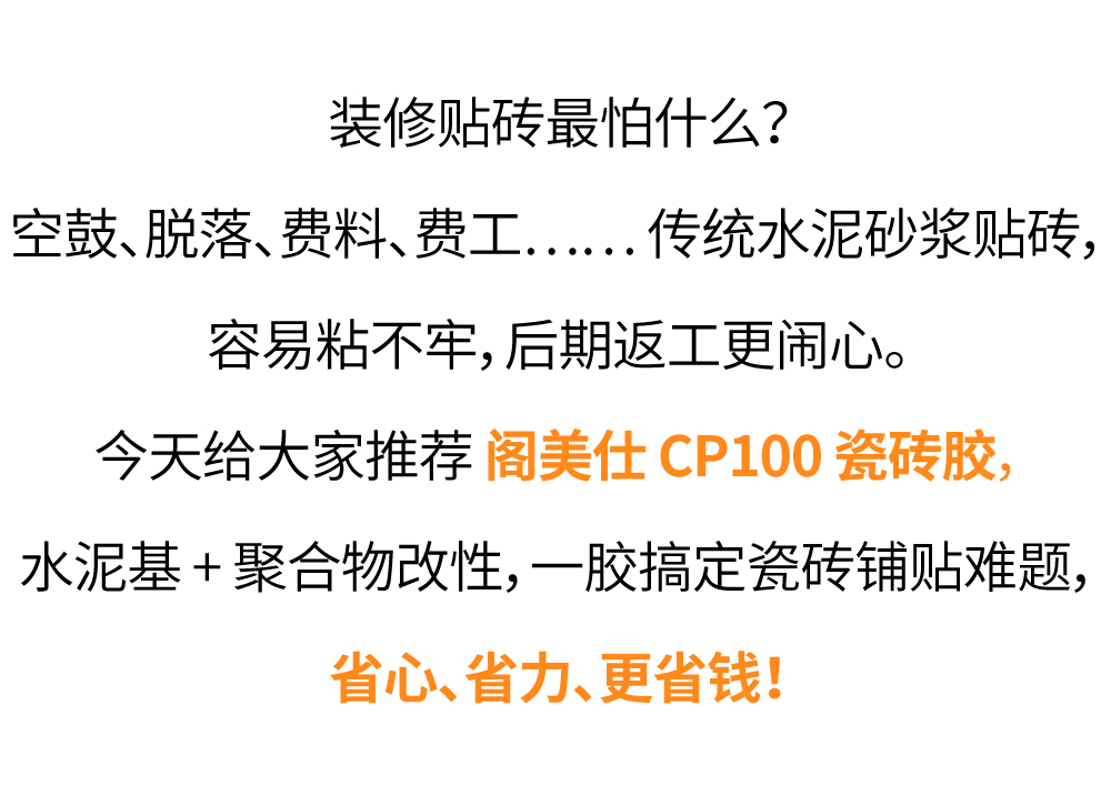 空鼓、脱落、费料、费工......传统水泥砂浆贴砖,容易粘不牢,后期返工更闹心。今天给大家推荐阁美仕CP100瓷砖胶,水泥基+聚合物改性,一胶搞定瓷砖铺贴难题,省心、省力、更省钱!